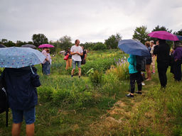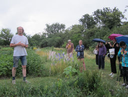 Zum Schluss trafen wir den Kompostexperten und Mitbegründer der Kleinen Stadtfarm Nikolai Ritter, der uns zuerst die Geschichte und Philosophie dieses Projektes näherbrachte. Dann gingen wir auf die Gemüsefelder – einem wichtigen Teil des 8 ha großen Geländes, dessen Verpächter die Stadt Wien ist, und auf dem 20 verschiedene Vereine mit ca. 400 Leuten zusammenarbeiten. Obwohl es hier zu regnen begann, haben wir philippinische, afghanische, syrische und hiesige Gartenkultur gesehen, intensiv, auf engem Raum, Gemüse neben Beeren und Blumen. Die Produktion ist hier um ein zwei- bis zehn (!!!!) faches höher als in einem „normalen“ Gemüsebetrieb, was an der geschickten Anordnung und Abfolge sowie an der besonders guten Erde, die mit „Terra Preta“-Kompost angereichert ist und wird, liegt.