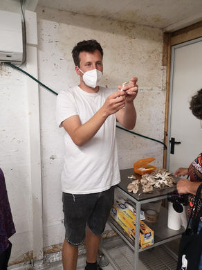Herausfordernd ist v.a. die Logistik, um aus der Gastronomie, von Pensionistenheimen, von großen Büros u.ä. den Kaffeesatz zu sammeln. Ist einmal alles vor Ort, werden die Zutaten gemischt und in Säcke gefüllt, die mit Löchern versehen sind. Diese lagern dann auf Regalen ca. 4 Wochen („Inkubationszeit“) lang bei 20 Grad Celsius. Dann beginnt in einem anderen Raum, in dem es 15 Grad Celsius und eine höhere Luftfeuchtigkeit hat, die „Fruchtung“, das bedeutet ganz einfach, dass hier die Schwammerl aus den Löchern sprießen! Nach ca. einer Woche ist Erntezeit! Da der Platz in der Kleinen Stadtfarm zu eng ist, können die Pilze in einem großen Keller in Klosterneuburg heranwachsen, der für die Fruchtung die idealen Bedingungen liefert!