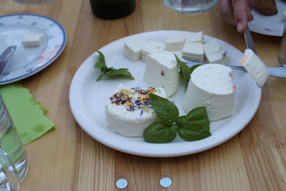 Maria und Franz Vogt haben den Hof der Eltern, der auch im Ortsverband liegt, bereits 1989 auf biologische Wirtschaftsweise umgestellt. Im März diesen Jahres haben sie den Hof an ihren Sohn und an ihren Neffen übergeben. Der im Verhältnis kleine Hof (9 ha Eigen-, plus 10 ha Pachtgrund) wird schon immer durch eine Vielfalt an Einkommensquellen im Vollerwerb geführt. Die jungen Hofübernehmer bringen bereits viele neue Aspekte ein - so gibt es zum Beispiel eine neue Getreidemühle und die Selbsternteparzellen wurden in Selbstversorgerflächen umgewandelt. Maria erzählte voller Leidenschaft über ihre Mutterschafe, über die Entstehung Gemeinschaftsgärten, Direktvermarktung und die kleinbäuerliche Wirtschaftsweise. Am Weg zu den vielfältigen Gärten begrüßten uns die Milchschafe lautstark. Die Familie Vogt kooperiert auch mit der Samengreisslerei, die die Erhaltung, Vermehrung und Weiterentwicklung von Gemüsesorten (https://samengreisslerei.at/) verfolgt. Der krönende Abschluss nach den interessanten Einblicken in den vielfältigen Hof waren köstlicher Schaffrischkäse, gschmackige Schafwürste und wunderbare Aufstriche.