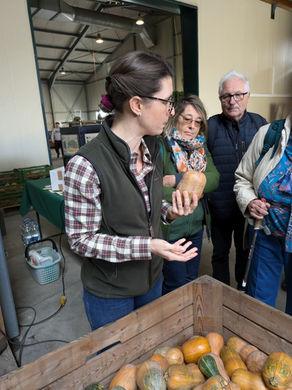 In der Lagerhalle sind wir mitten im Hochbetrieb während der Erntesaison, der durch die bevorstehenden Halloween-Feierlichkeiten nochmals intensiviert ist. Der richtige Umgang mit der Lagerung ist dabei entscheidend, um die Qualität der Kürbisse zu bewahren und sogar zu verbessern – ein Fokus der heutigen Veranstaltung. Kürbisse können, bei optimaler Lagerung, mehrere Monate haltbar sein. Je länger die Lagerzeit, desto intensiver wird das Aroma des Fruchtfleisches.