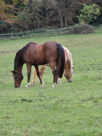 der zweite Schnitt einer artenreichen Wiese voller Kräuter und Gräser – gesundes Futter, das den Tieren gut bekommt. Verena betont, dass sie kaum Tierarztkosten haben und ihre Tiere sehr alt werden. Kühe und Pferde weiden hier in Co-Existenz nebeneinander – ein wunderschönes, harmonisches Bild.