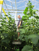 112 m groß, die Pflanzen werden aus der Steiermark oder Holland oder Ungarn in Kokos-Substrat angeliefert und Anfang Jänner ins Glashaus gebracht, gedüngt und gegossen, geheizt wird mit Gas, die CO2-Konzentration ist im Glashaus 2 bis 3 Mal so hoch wie in normaler Luft, was gut für die Pflanzen ist. Die Pflanzen werden in einem ausgeklügelten System an lange Schnüre gebunden, gewickelt und weit nach oben gezogen. Sie haben schöne gelbe Blüten und wachsen zuerst in die Länge und erst dann in die Breite. Nach ca. einem Monat beginnt die händische Ernte. Jede Pflanze macht in der Woche 6 Blätter und 3 bis 4 Gurken, die Blätter werden weggeräumt, weil sonst leicht Pilze entstehen können (Pflanzengrün geht an die